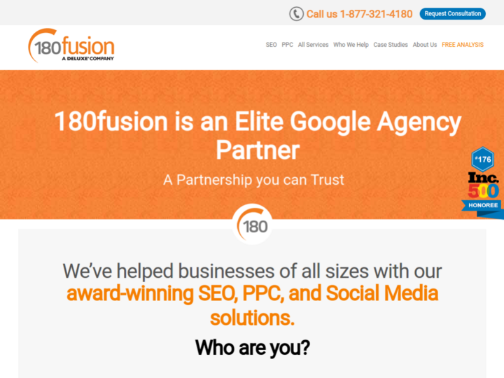 180fusion is run by a team of seasoned software and internet executives headquartered in California with our Center of Excellence in Utah. 180fusion has been recognized as one of the most innovative search engine marketing firms providing digital marketing products and services to thousands of clients across the globe. Its suite of integrated products include SEM, National and Local SEO, PPC Management, Mobile Search, and Social Media Marketing to help SMB’s to Fortune 1000 companies succeed online. 180fusion was featured by Inc. Magazine 500 Fastest Growing Private Companies in America, one of the fastest growing in the Advertising and Marketing industry , and awarded “Top 100 Best Places to Work.”