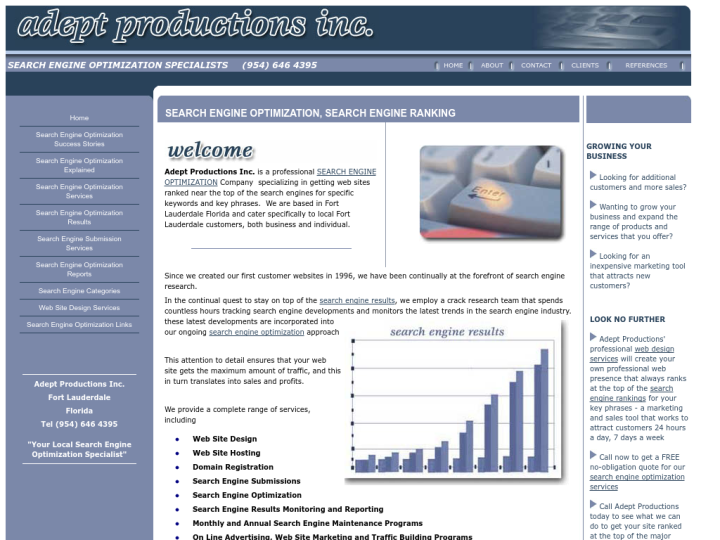 Adept productions is a search engine optimization company. The company specializes in getting higher ranks of your website in the search engine result pages. It is based in Fort Lauderdale Florida and serve for specifically Fort Lauderdale Florida locals. The team working with the company has been on the forefronts of the search engine results since it created its first website in the year of 1996. The services provided by the company includes website design, hosting, domain registration, SEO, search engine submissions, online advertising and many more.