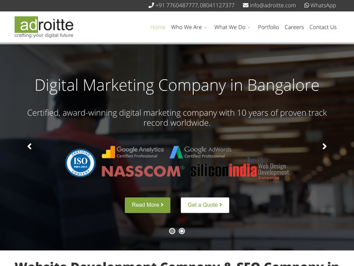 Adroitte is a Award winning certified digital marketing company in Bangalore, India serving clients globally. With 10+ years of experience and 100+ clients our innovation, attention to details and competitive pricing has made us a trusted name in the industry.