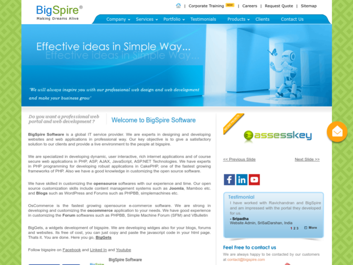 BigSpire Software is a global IT service provider. We are experts in designing and developing websites and web applications in a professional way. Our key objective is to give a satisfactory solution to our clients and provide a live environment to the people at the big spike.