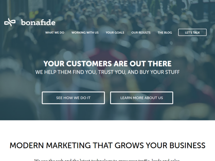 Bonafide is an online/digital marketing agency based in Houston, Texas that works with growth-minded businesses nationwide. We help companies find new customers on the internet using market research, inbound marketing, CRM and sales enablement, search engine optimization (SEO), content marketing, pay-per-click advertising (PPC), social media, PR, technology and more.