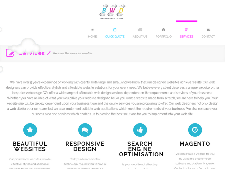 Bradford Web Design works closely with all of our clients to ensure that their experience is simple, effective and ultimately profitable. We fine tune functionality to ensure that clients and their customers needs are straightforward and unproblematic. We have designed many websites for clients combining attractive images with clear designs and efficient coding. Please view our portfolio to see some of our latest work.