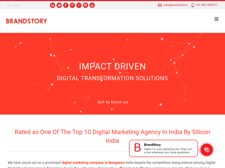BrandStory is a Digital transformation company that encompasses services from creating your Brand identity through digitally defining your ideas and focusing on getting your products & services to the ever growing digital market thereby increasing your brand's awareness, sales and desire. We are passionate to craft your brand's digital journey. Backed by rich industry and real time experience in Bangalore, Dubai, Singapore and other overseas markets.