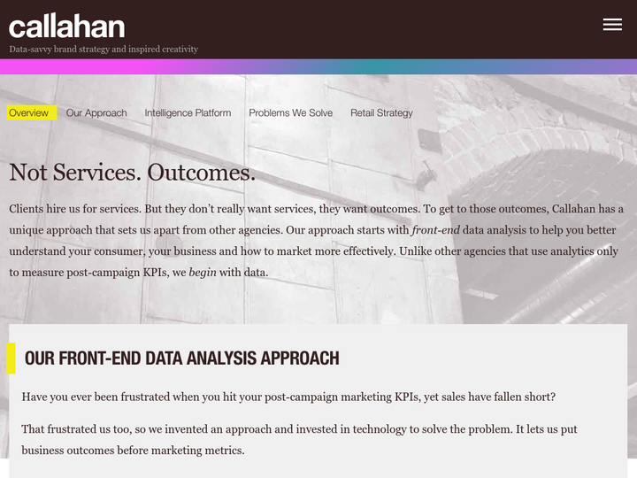 Clients hire us for services. But they don’t really want services, they want outcomes. To get to those outcomes, Callahan has a unique approach that sets us apart from other agencies. Our approach starts with front-end data analysis to help you better understand your consumer, your business and how to market more effectively. Unlike other agencies that use analytics only to measure post-campaign KPIs, we begin with data.