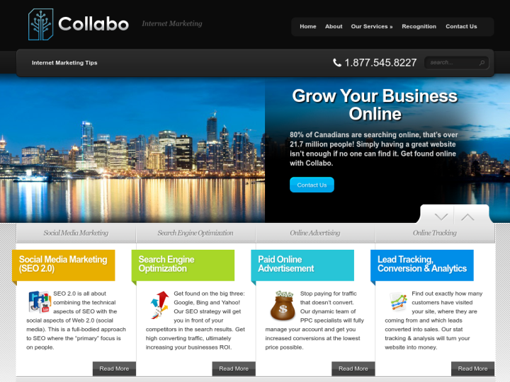 Collabo is an internet marketing firm that aims at helping its clients grow their online businesses. The company is all in one marketing company that leverages internet by social media outlets, search engine optimization, pay per click and web analytics to bring more traffic and thereby increasing revenue. Collabo has a small team of web designers, marketing experts and programmers that holds expertise in their respective fields. The company generates cost effective solutions to make greater profits for small businesses. It specializes developing marketing strategies, professional website designs with content management system and web hosting options.