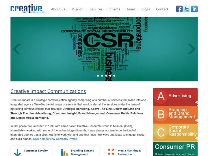 Creative impact is a strategic communication agency comprising of a number of services that rolled into one integrated agency. We offer the full range of services that would cater all the services under the term of marketing communications that include: Strategic Marketing, Above The Line, Below The Line and Through The Line advertising, Consumer Insight, Brand Management, Consumer Public Relations and Digital Media Marketing.