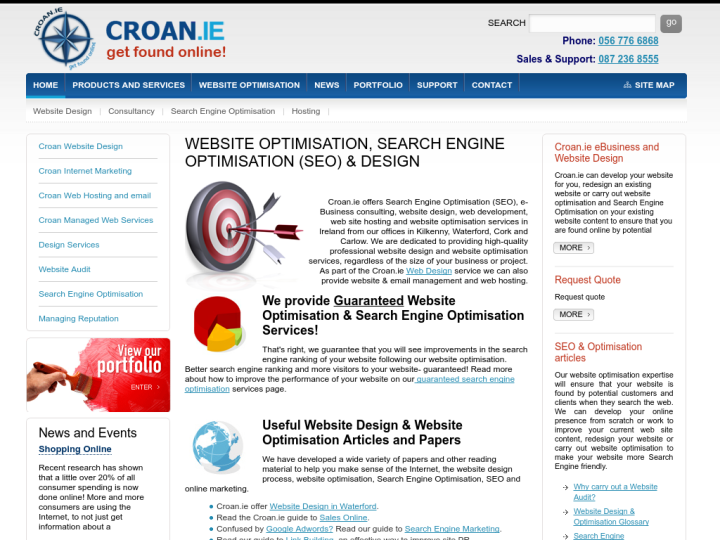 Croan.ie is a full service business operating company which offers Search Engine Optimization (SEO), e-business consulting, website design, development, web site hosting and optimization services in Ireland. The company has its offices in Kilkenny, Waterford, Cork and Carlow; and is fully determined to increase quality traffic to your web site.