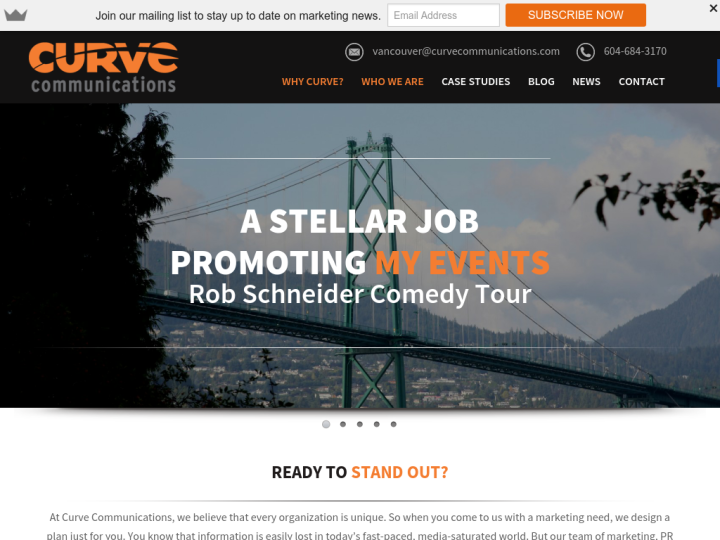 Curve communications is an internet marketing firm based in BC. The company understands the products and services provided by you and observes that what are you trying to accomplish. From web designs to marketing, the company fulfills every single business need. The services offered by the company includes web designing, content creation, graphic design, online marketing, video production, event planning and social media advertising. The team of journalists associated with the company understands the public and media relations and aids creative storytellers come out of the shell. Further, the content creation team creates unique content that is actually read by potential customers.