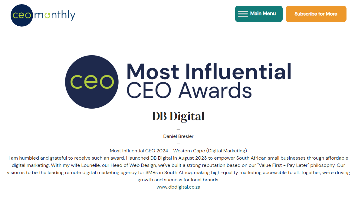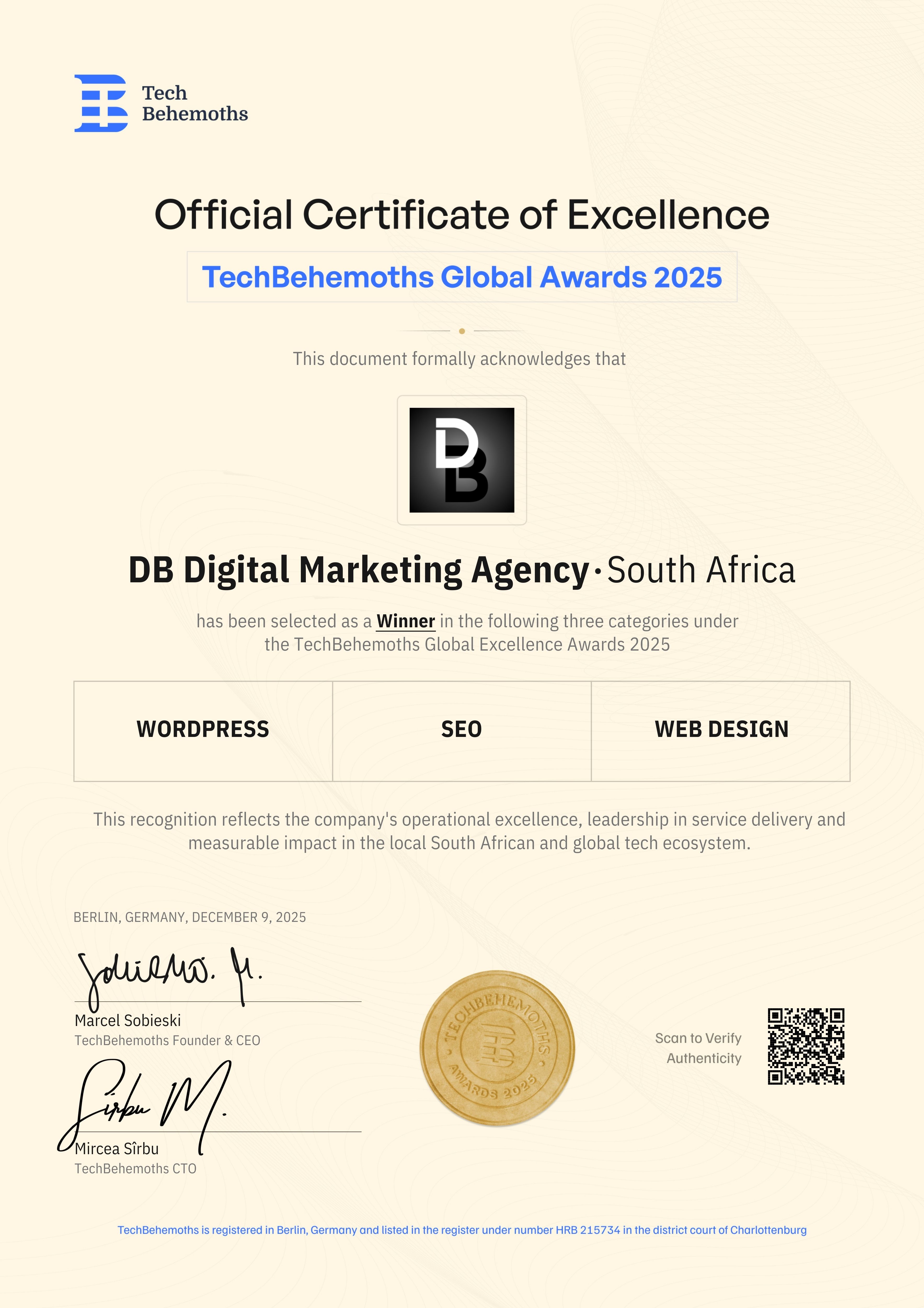 DB Digital, a remote, award-winning digital marketing agency in Cape Town, South Africa, offers tailored marketing services to meet your small business needs. From SEO and social media marketing to web design and content creation, we optimise your search engine presence for better visibility and results. Get in touch with us to boost your business with affordable, quality search engine optimisation and online marketing strategies.