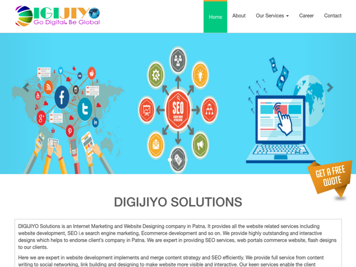 DIGIJIYO Solutions is an Internet Marketing and Website Designing company in Patna. It provides all the website related services including website development, SEO i.e search engine marketing, Ecommerce development and so on.