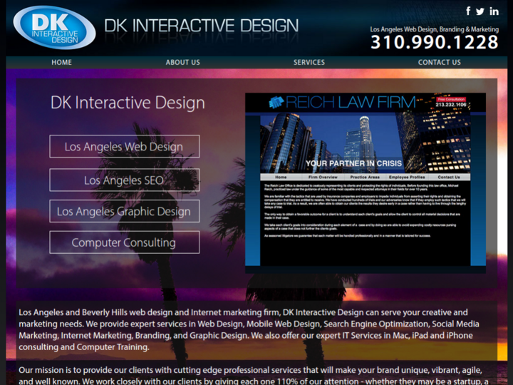 Los Angeles web design & marketing firm DK Interactive Design specializes in web design and internet marketing including complete solutions for web design, mobile web design, seo, as well as graphic design and branding. We also offer web site maintenance, revamping of your existing web site, advertising & banner design, corporate identity packages, photo retouching, email marketing, social media marketing and IT consulting. We are passionate about creating stunning results driven web sites with a focus on design and usability that will increase your ROI. DK Interactive Design has been part of the Los Angeles web design landscape since 1997.