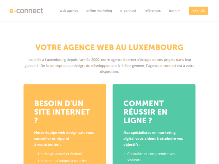 Installed in Luxembourg since the year 2000, our internet agency deals with your projects as a whole. From design to design, from development to hosting, the e-connect agency is at your disposal.