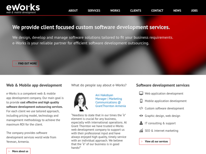 e-Works is a web & mobile development company focused on technology and creativity. We provide IT outsourcing services worldwide from Yerevan / Armenia.