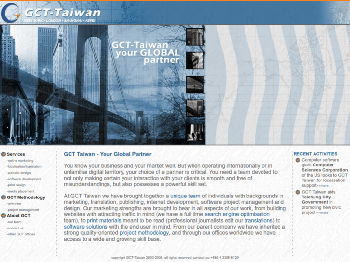 At GCT Taiwan we have brought together a unique team of individuals with backgrounds in marketing, translation, publishing, internet development, software project management and design. Our marketing strengths are brought to bear in all aspects of our work, from building websites with attracting traffic in mind (we have a full time search engine optimisation team), to print materials meant to be read (professional journalists edit our translations) to software solutions with the end user in mind. From our parent company we have inherited a strong quality-oriented project methodology, and through our offices worldwide we have access to a wide and growing skill base.