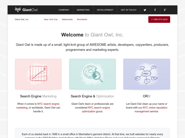 Giant Owl is a tight-knit group of artists, developers, copywriters, producers, programmers and marketing experts which was started back in 1998 to handle your local, nationwide and worldwide business. We are one of the best advertising agencies in NYC and believe in being highly committed to our clients.