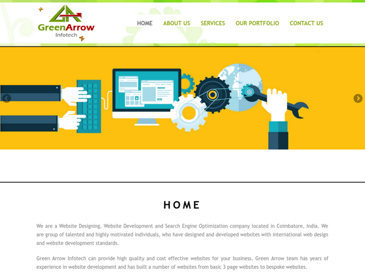 Green Arrow Infotech is web development company located in Coimbatore, India. Our dedicated team of professionals combine all the elements to not only design and create high quality internet solutions, but with many years in the market place we provide the guidance to maximise the return from your investment.