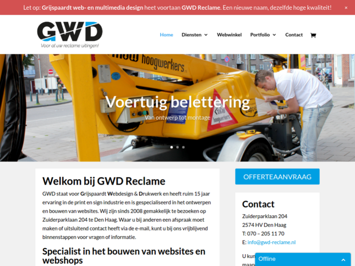 GWD stands for G rijspaardt W ebdesign & D rukwerk and has more than 15 years experience in the print and sign industry and is specialized in designing and building websites. We are easy to visit since 2008 at Zuiderparklaan 204 in The Hague. Where you have to make an appointment with others or you only have contact via e-mail, you can contact us without obligation for questions or information.