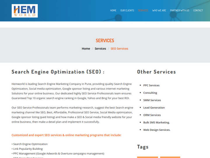 Hemworld is leading Search Engine Marketing Company in Pune, providing quality Search Engine Optimization, Social media optimization, Google sponsor listing and various internet marketing Solutions for your online business.