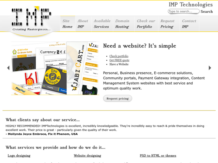 Incredible Mind People (IMP) Technologies is an information Technology company from Ludhiana, Punjab, India. We have teams of, as the name says, incredible designers and programmers with quality experience in creating small to large scale successful websites.