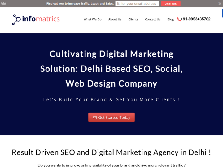 Infomatrics Media is a Delhi based Digital Marketing & Web Design company that provides SEO, Social Media, PPC services to startups & small businesses with world class qualified traffic generation and lead closures strategies. We are of dedicated professionals, whose goal is to go beyond the sale, thinking outside the box to solve problems and create long-term relationships with each and every client. We worked more than 100 clients and they seen improvement in their traffic and sales. Infomatrics offers a wide range of services including: Detailed research, Internet targeting, Website development, Google analytics, and Statistical reporting.