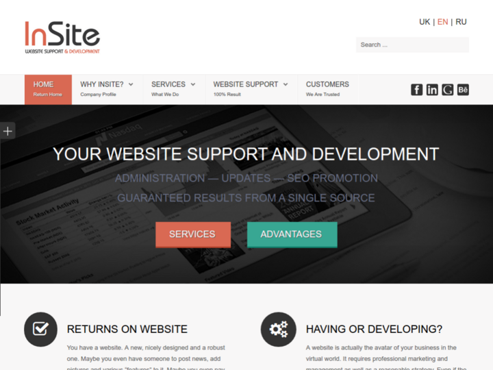 InSite leading specialists have been working in the field of online management since 1997, virtually since commercial Web emergence in Eastern Europe. Since 2005 we have been engaged in direct implementation of projects in the field of website creation, support and development, copywriting, search engine optimization for Google and Yandex, translation and localization of websites, etc.