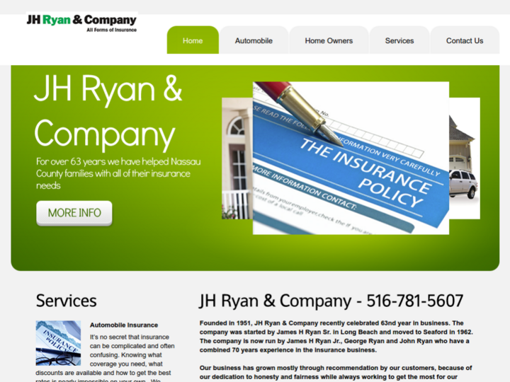 Founded in 1951, JH Ryan & Company recently celebrated 63nd year in business. The company was started by James H Ryan Sr. in Long Beach and moved to Seaford in 1962. The company is now run by James H Ryan Jr., George Ryan and John Ryan who have a combined 70 years experience in the insurance business.