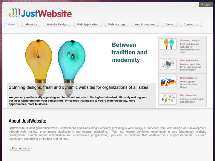 JustWebsite is next generation Web Development and Consulting Company providing a wide range of services from web design and development through web hosting, e-commerce applications and internet marketing. With our team's combined experience in web (designing), website development, search engine optimization and e-commerce programming, you can be confident that whatever your project demands, our web developers can deliver on budget and on time.