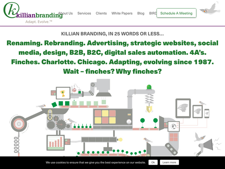 Founder Bob Killian, branding guru (he prefers “bomb-throwing disruptor”) stays involved in every client relationship, in vivid contrast to famous names on some other agency doors, e.g., Leo Burnett, J. Walter Thompson, Foote Cone Belding, BBDO – all nine of whom would be, shall we say, extremely un-involved?