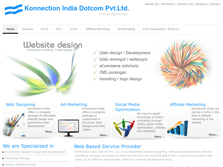 Konnection India Dotcom Pvt Ltd is specialized in dynamic and creative web solutions and services. We take pride in providing a striking communication platform which enables our customers to present their businesses effectively. It is based in Gurgaon and offers a wide range of web based services including graphic design, search engine marketing, affiliated marketing, web programming, web hosting, SEO, web consultancy and web management services.