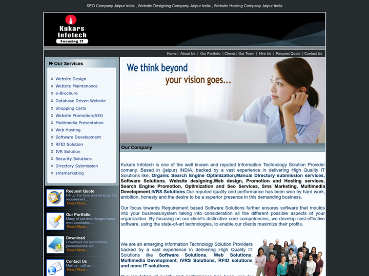 Kukars Infotech is a leading provider of comprehensive web products, solutions and internet services i.e web hosting, domain names, website design, web script and application, web programming, search engine optimization, portal development, shopping carts, Flash presentation, e-Catalogue, software development and have recently pioneered in RFID solution, IVR solution.