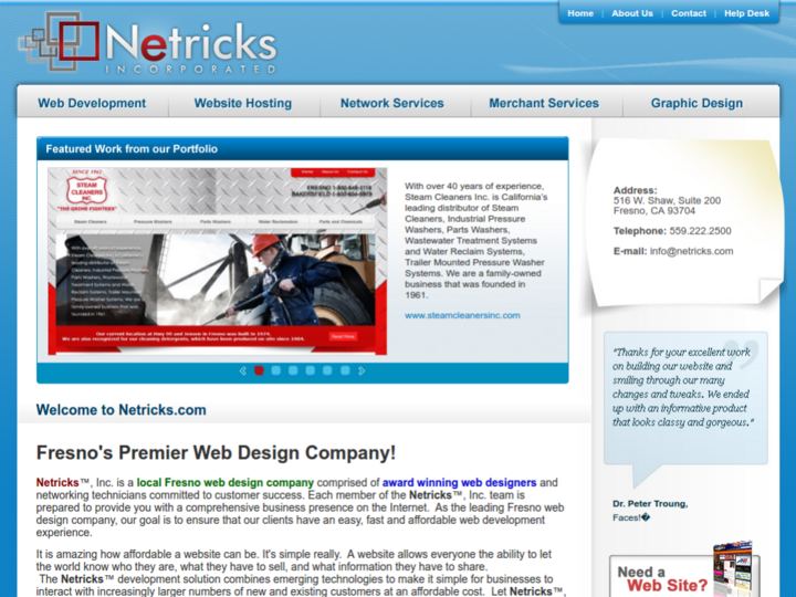 Netricks™, Inc. corporate headquarters is located in the heart of California's Central Valley. We pride ourselves in providing serivices to local companies. We believe that if you live in the Central Valley you have a responsibility to treat local companies like you would your own. The Netricks™, Inc. staff consists of qualified coders, great graphic designers, and a small team that treats every web project, big or small, with the same passion and commitment.