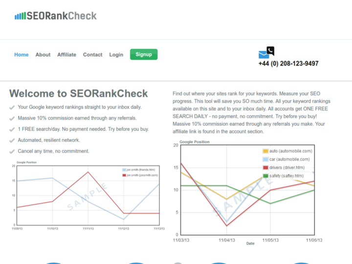 Find out where your sites rank for your keywords. Measure your SEO progress. This tool will save you SO much time. All your keyword rankings available on this site and to your inbox daily. All accounts get ONE FREE SEARCH DAILY - no payment, no commitment. Try before you buy! Massive 10% commission earned through any referrals you make. Your affiliate link is found in the account section.