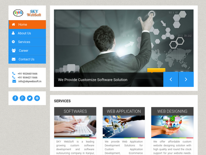 SKY WebSoft offers customized IT solutions and services that meet different needs of businesses. We provide responsive web design, web development, application development and enterprises software development services among others. Our company is a group of creative and genius minds. We evolve with the changing needs of our clients, thus keeping ourselves abreast with the latest technologies. We support our customers to align their technology solutions with their unique goals and mission – to create the maximum results on technology investments.