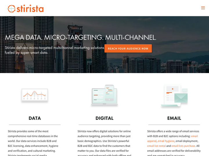 Founded in September 2009, Stirista is a digital marketing agency that specializes in B2B and B2C segmentation, email marketing, and display advertising. We love data and want to put it to use for you. We believe our services can help you find new clients, and we’ll do our best to accomplish that.