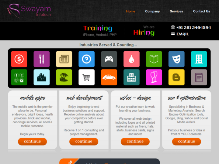 Swayam Infotech is an established web and desktop development company delivering web and desktop development services of any complexity to clients worldwide. Being in IT business for over 7 years Swayam has a strong team of skilled experienced IT experts. Our customers are companies of all sizes ranging from start ups to large enterprises who realize that they need a professional internet solution to generate revenue streams, establish communication channels or streamline business operations.