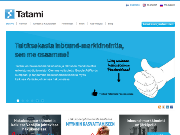 Tatami is Finland's first inbound marketing agency. Inbound marketing refers to online marketing efforts that enable potential customers to get interested in the company's offer (services and products) on their own. In a traditional outbound business, your company merely screams for its message in search of customers. Tatami's inbound marketing services, on the other hand, help your business find and direct your message to those who are already interested in the supply of your business.