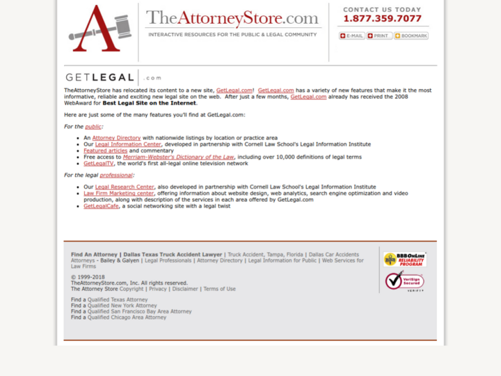 TheAttorneyStore has relocated its content to a new site, GetLegal.com! GetLegal.com has a variety of new features that make it the most informative, reliable and exciting new legal site on the web. After just a few months, GetLegal.com already has received the 2008 WebAward for Best Legal Site on the Internet.