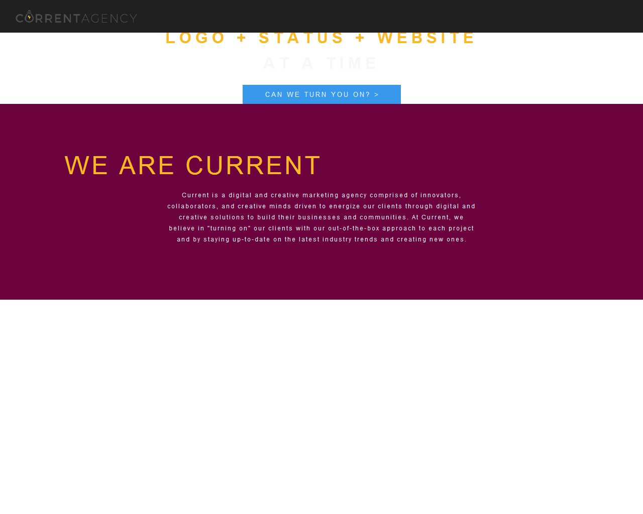 Current is a digital and creative marketing agency comprised of innovators, collaborators, and creative minds driven to energize our clients through digital and creative solutions to build their businesses and communities. At Current, we believe in "turning on" our clients with our out-of-the-box approach to each project and by staying up-to-date on the latest industry trends and creating new ones.