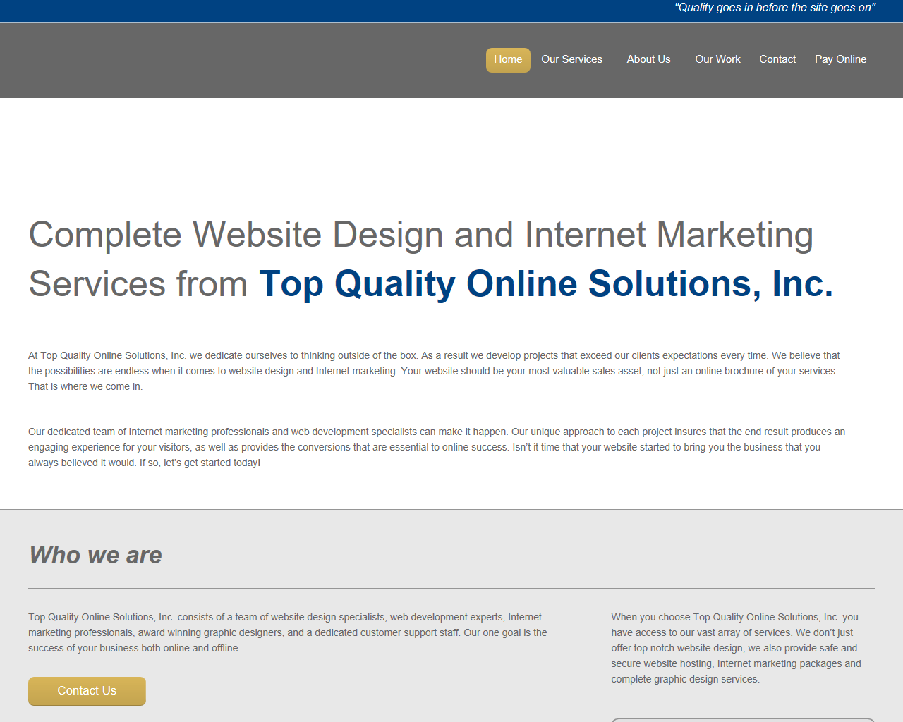 At Top Quality Online Solutions, Inc. we do things differently. We don’t set out to develop projects that are of limited scope and imagination. You see, we believe that anything is possible when it comes to website design and Internet marketing. We believe that rules are made to be broken, and discoveries are just around the corner waiting to be discovered.