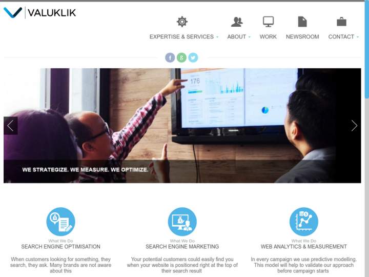 Valuklik is a Certified Google partner which has a complete understanding of digital marketing including Search Engine Optimization (SEO), Search Engine Marketing (SEM) and advanced Analytics. The organization works on the mission of boosting your business leads and revenues by a dynamic collaboration of technology and branding.