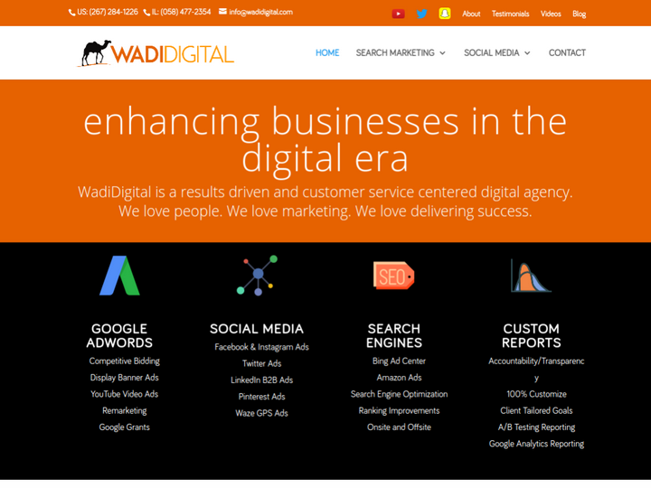 WadiDigital is a full service digital agency. We specialize in paid search, remarketing, SEO, video seo, e-commerce, social media marketing, B2B, startups and non-profits. Talk to us about your goals and where you want to take you business and we will help you get there with a custom marketing strategy that is tailored towards your specific company’s goals and objectives.