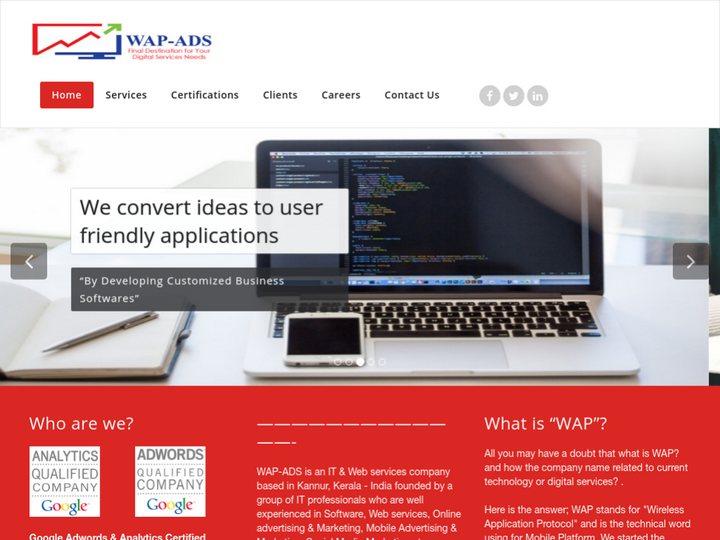 WAP-ADS is an IT & Web services company based in Kannur, Kerala - India founded by a group of IT professionals who are well experienced in Software, Web services, Online Advertising & Marketing, Mobile Advertising & Marketing, Social Media Marketing etc.