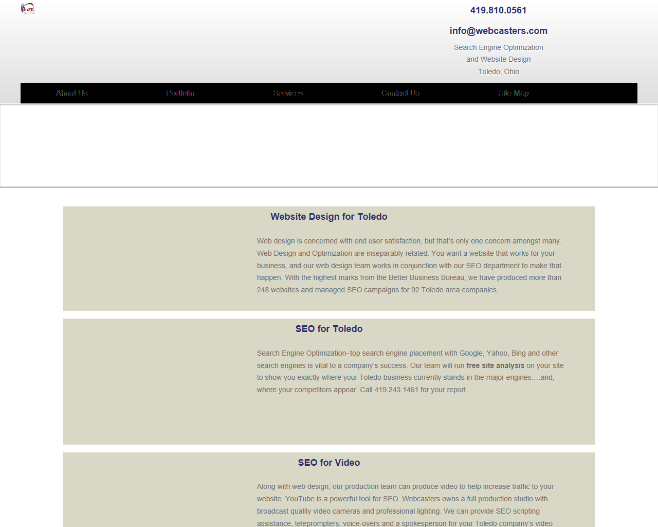 Priding ourselves on staying local, Webcasters has been in business for the last 12 years to assist Toledo, Ohio businesses with increasing their Internet presence. With the highest marks from the Better Business Bureau, we have produced more than 270 websites and managed Search Engine Marketing for 92 companies. As the SEO industry has grown, so have we. And more importantly, so has the functionality and usefulness of our client’s websites. It’s our sincere belief that SEO and Internet marketing are as important to your Toledo, Ohio company as utilities.