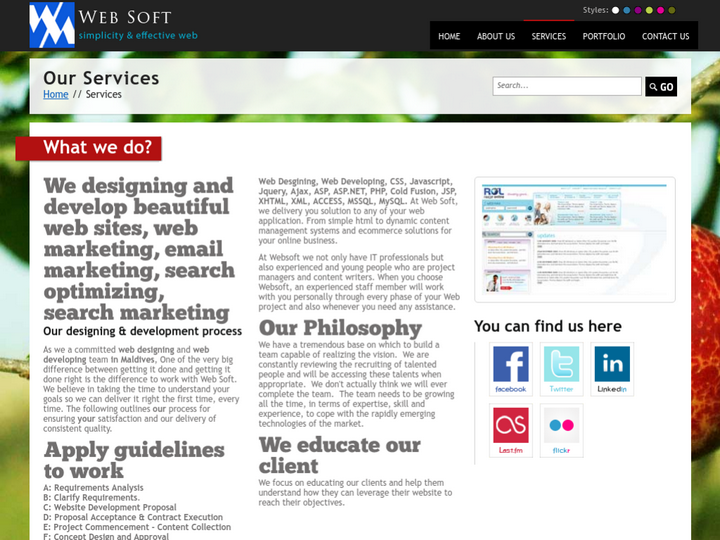 Websoft, is a registered business name in Maldives since 2005 to provide professional web designing and developing solutions for government, corporate business and companies interested in outsourcing their online applications. We have a team of talented designers and committed developers.