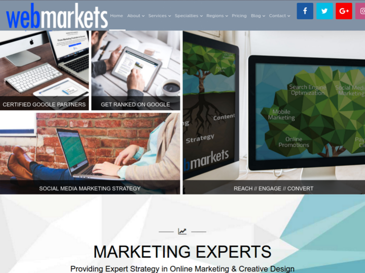 Founded in 2011 on the basis of reliability, accountability, and transparency, WebMarkets focuses on unique online marketing strategies and customer care. With consumer demand to utilize online websites like Google Yahoo, Facebook, Instagram, and more, a specific talent base and knowledge was needed in the community. The online marketing management industry demands professional knowledge in website design, online marketing, search engine optimization, social media marketing & content creation. What makes all of this all stick together? A team of qualified online marketing professionals, managing your online presence, who bring honesty, integrity, and a strong work ethic.