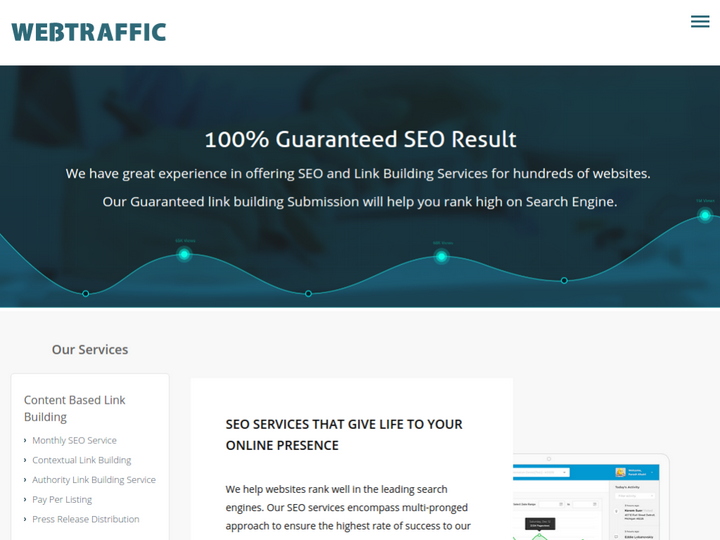 Webtraffic is a full-fledged Search Engine Optimization Company offering end-to-end ranking solutions. As one of the most experienced players in the SEO industry, we take pride in helping our customers with our flagship ranking solutions