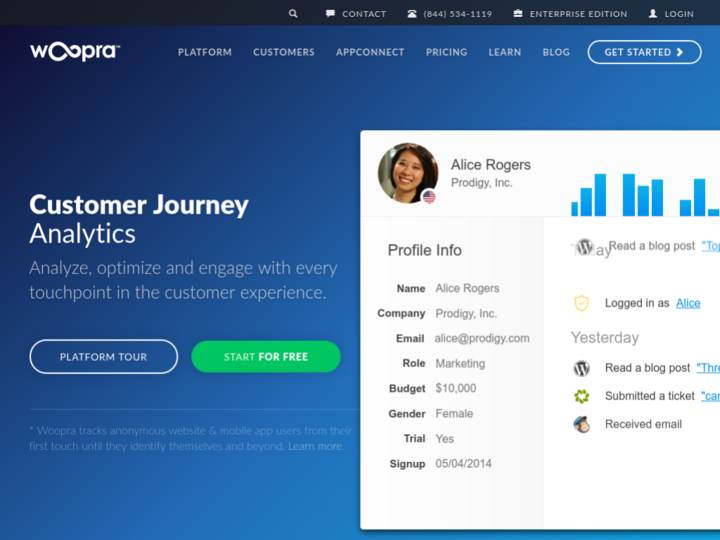 Woopra is designed to track new and unidentified website and mobile app visitors from their first touch. The user is assigned a unique ID and all anonymous activity is tracked. You’ll also have data regarding the user’s location, system, platform, referrer (if applicable) and more!